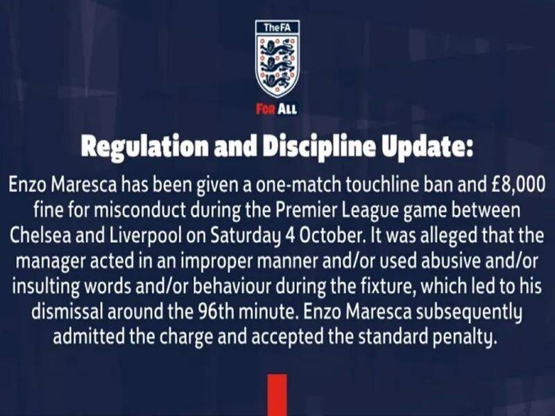 英足总已经发出公告,切尔西面对利物浦的比赛中,第96分钟,马雷斯卡由于存在不当行为,存在使用侮辱性的言语,主裁判因此出示红牌,被罚离场。有鉴于此,马雷斯特需要禁赛一场,同时还要缴纳8000英镑的罚款。马雷斯卡已接受了关于事实的指控,愿意接受相应的处罚。